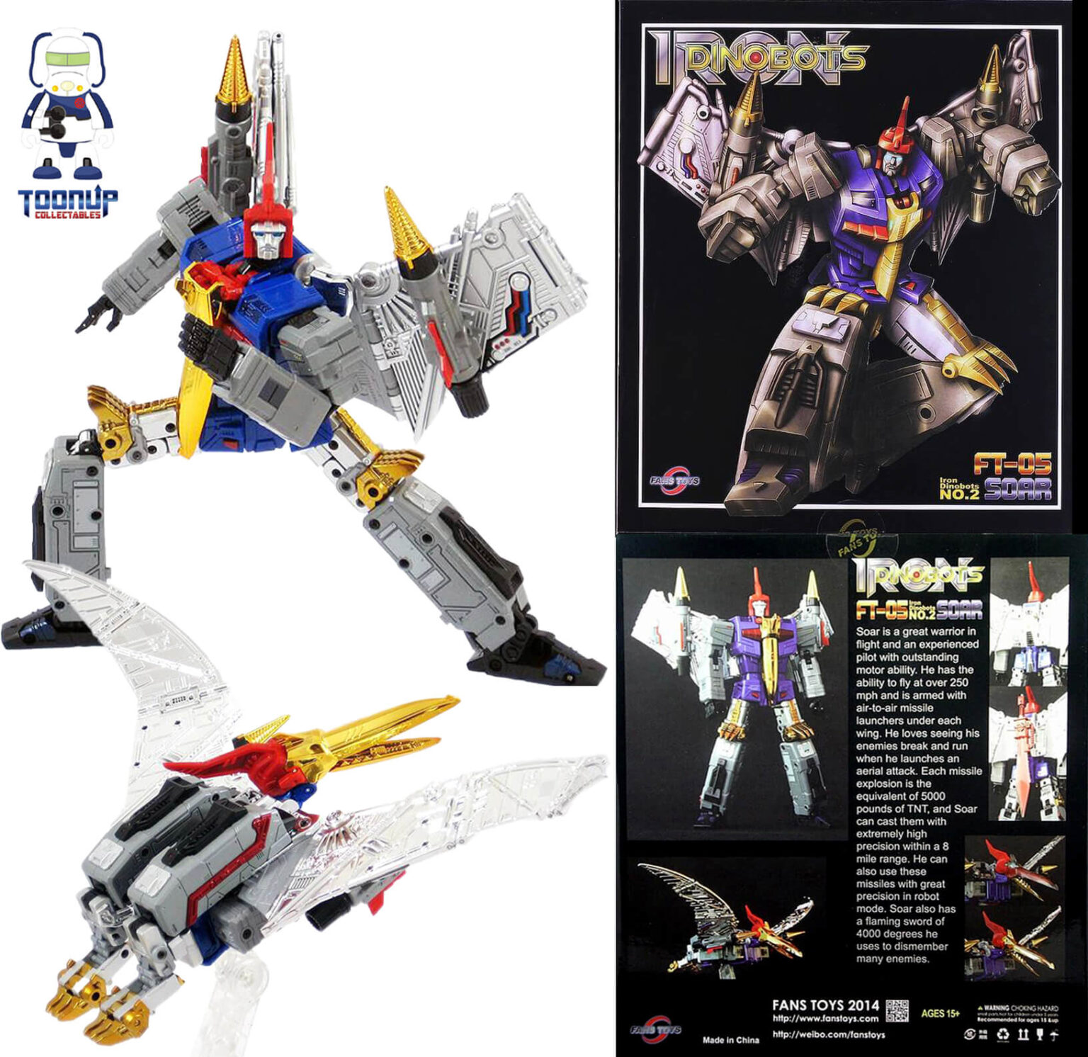 FT-05 Soar Blue Version takes your collection to the next level with this Masterpiece scaled, highly articulated 3rd Party transformable figure. This figure stands 9.5-inches tall in robot mode and transforms from a Pteranodon to robot and back. FT-05 Soar Blue Version is Masterpiece scaled and will scale to other Takara Tomy Transformers Masterpiece series figures, 3rd Party Masterpiece scaled as well as other Fans Toys items aleady in your collection.