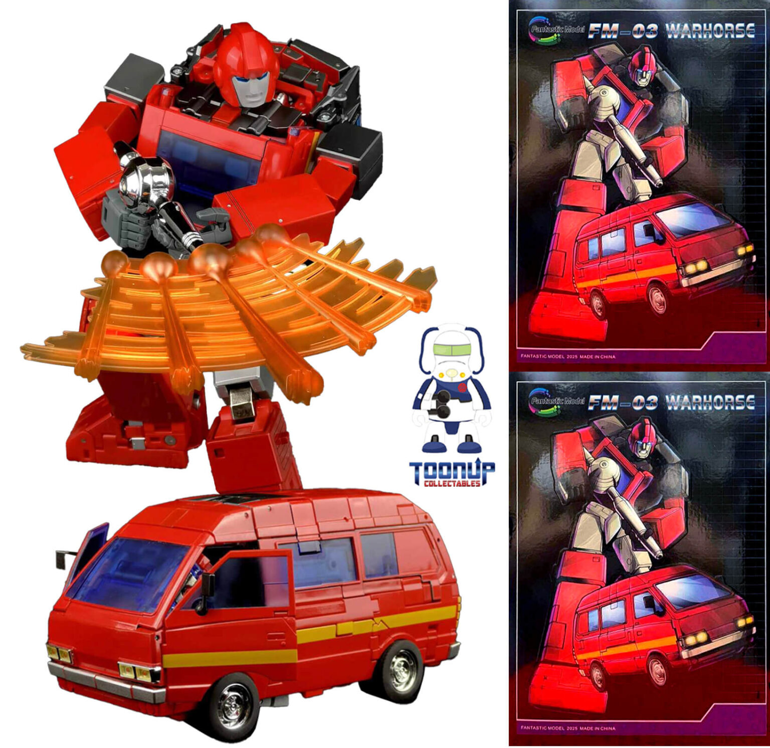 FM-03 Warhorse takes your collection to the next level with this Masterpiece scaled, highly articulated 3rd Party transformable figure. This figure stands 8.3-inches tall in robot mode and transforms from a Mini Van to robot and back. FM-03 Warhorse is Masterpiece scaled and will scale to other Takara Tomy Transformers Masterpiece series figures, 3rd Party Masterpiece scaled as well as other Fans Toys items already in your collection.