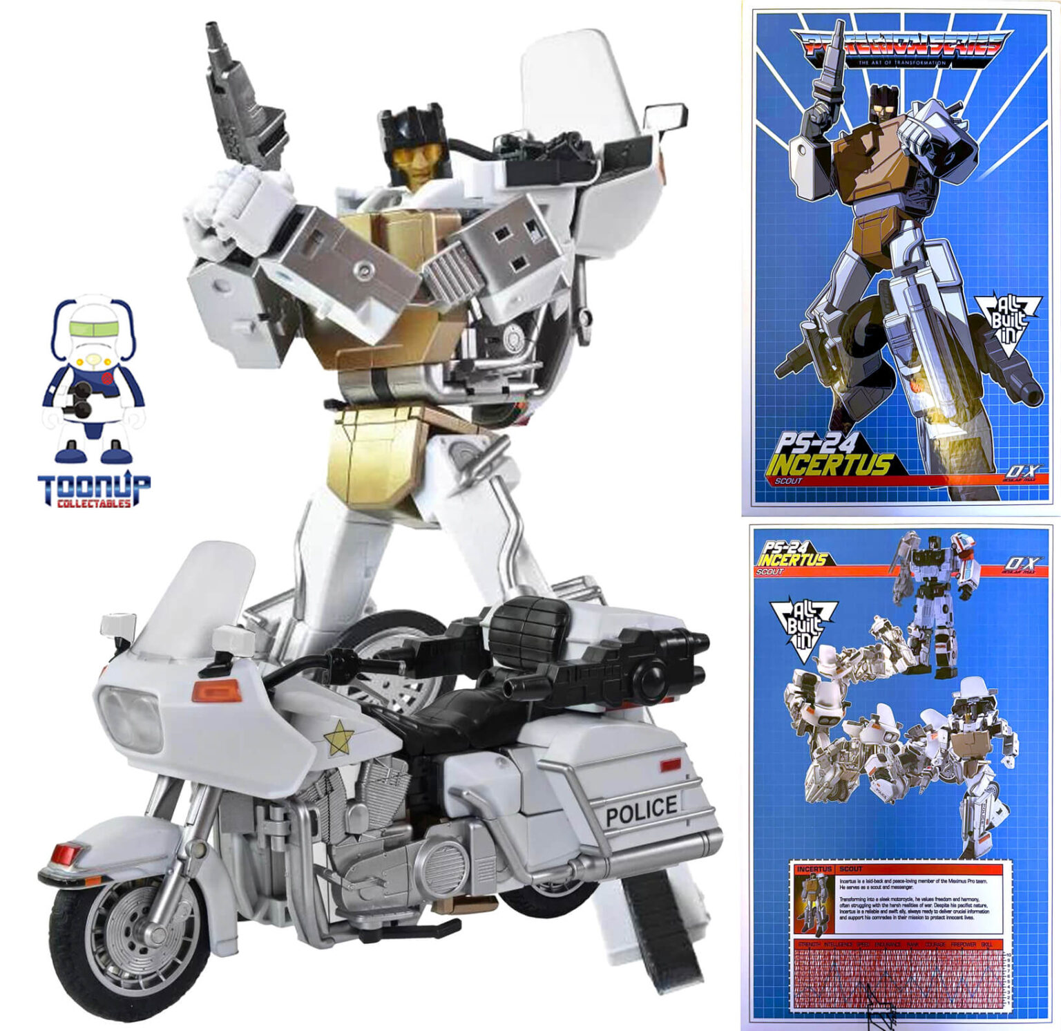 Incertus can convert modes between Bot to the Police Motorcycle to the right leg of Maximus Pro using his own components. He is 7.5″ tall, and he has decent articulations that match the entire Perfection Series line.