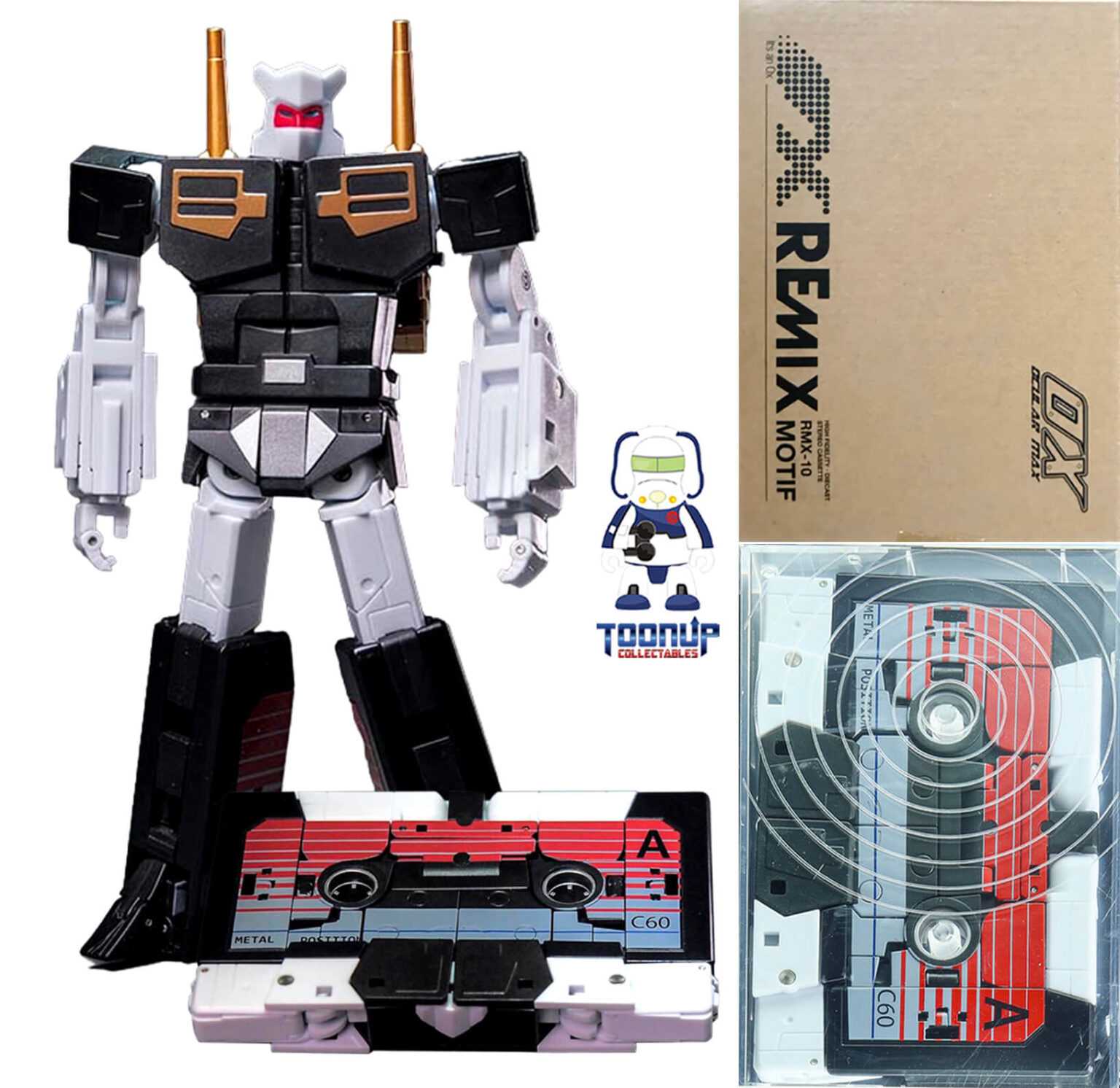 From the 1:1 cassette tape, RMX-10 Motif transforms to a robot with robust build. Mastermind Creations has created a piece that is enjoyable to handle in 2 modes. In the nostalgic cassette mode, Motif features detailed markings that look realistic in display. In robot mode, Motif has many joints for posing, including the chest butterfly and wide range ab crunch.