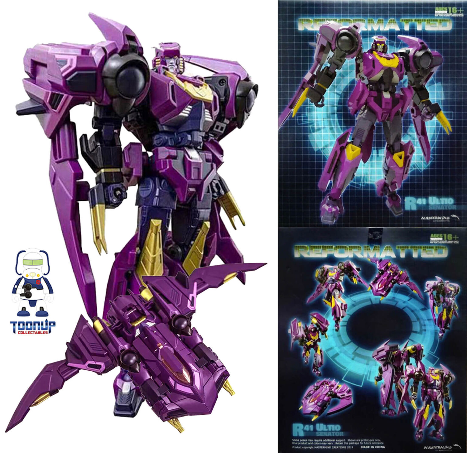 R-41 Ultio is a Reformatted Scale figure that is approximately Reformatted Scale Scale, stands 7.3-inches tall in robot mode and transforms from Jet to robot and back. R-41Ultio is a political mastermind and manipulator. Working from the shadows, Ultio wields razor sharp blades and features multiple wing configuration!